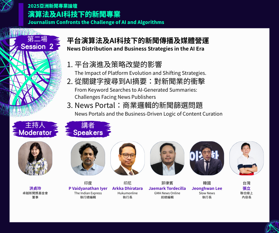2025年亞洲新聞專業論壇主題為「演算法與AI科技下的新聞專業」。論壇為期兩天,規劃五大場次,從「編採流程與內容生產」、「新聞傳播與媒體營運」以及「讀者信任與興趣的流失」三大面向,全面檢視社群平台演算法對新聞業的衝擊,並探討生成式AI所帶來的機會與挑戰。論壇亦將聚焦於新聞業面對當前困境的因應策略及可能解方,包括協助辨識有價值資訊及提升新聞信任的做法,並探索另類新聞聚合模式,以及運用AI科技幫助好新聞被看見等。