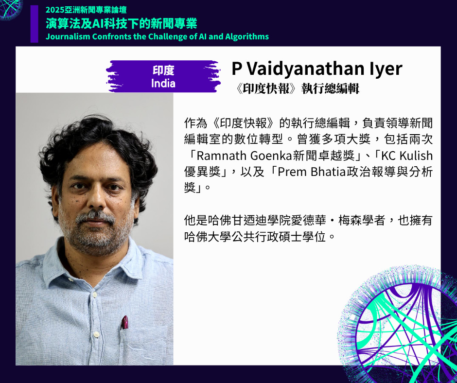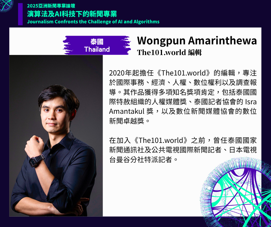 2025年亞洲新聞專業論壇主題為「演算法與AI科技下的新聞專業」。論壇為期兩天,規劃五大場次,從「編採流程與內容生產」、「新聞傳播與媒體營運」以及「讀者信任與興趣的流失」三大面向,全面檢視社群平台演算法對新聞業的衝擊,並探討生成式AI所帶來的機會與挑戰。論壇亦將聚焦於新聞業面對當前困境的因應策略及可能解方,包括協助辨識有價值資訊及提升新聞信任的做法,並探索另類新聞聚合模式,以及運用AI科技幫助好新聞被看見等。