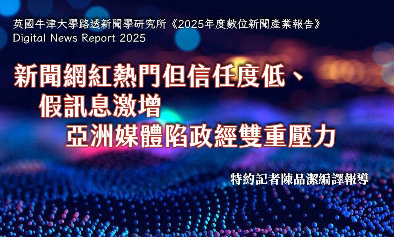 英國牛津路透新聞學研究所公布《2025年度數位新聞產業報告》(Digital News Report 2025),多數國家傳統媒體的讀者參與度下滑、信任低迷、數位訂閱停滯,難以與大眾產生連結。大眾選擇性的「迴避新聞」現象持續。